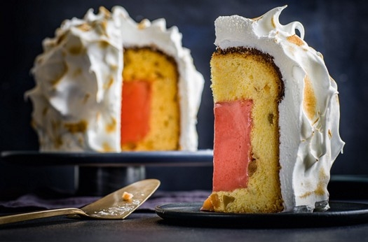 Place the frozen panettone on a baking sheet and spread the meringue over it. Bake for 7-9 minutes until the meringue is lightly golden. Slice into wedges, to serve.