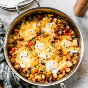 This easy breakfast skillet recipe is loaded with the good stuff including potatoes, eggs, bacon and sausage topped with shredded cheese. it's a quick, hearty breakfast all made in just one pan!