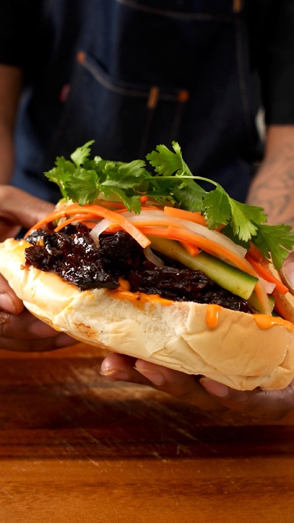 A bold twist on the classic vietnamese bánh mì, this burnt end bánh mì is packed with tender, smoky chuck roast burnt ends coated in a sweet and tangy barbecue sauce. the savory, melt-in-your-mouth beef is balanced by crunchy, pickled carrots and daikon, fresh cucumber matchsticks, and a spicy kick from sliced jalapeños. topped off with fresh cilantro and a creamy sriracha aiaïoli all inside a baguette, this sandwich is a flavor-packed fusion of smoky, spicy, and fresh notes that will have your taste buds dancing. check out brandon on instagram @brandongouveia for more recipe inspo!