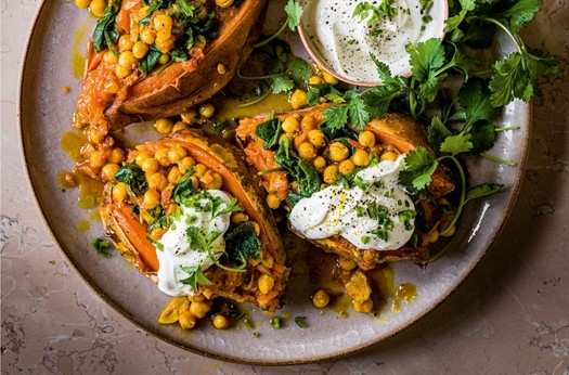 Meanwhile, check the curry for seasoning and add more salt if needed. Place the lid on top to keep warm. To serve, split the sweet potatoes down the middle, add a little salt and butter, spoon the curry over, with a splodge of yogurt on top and a sprinkle of fresh chilli and coriander leaves.