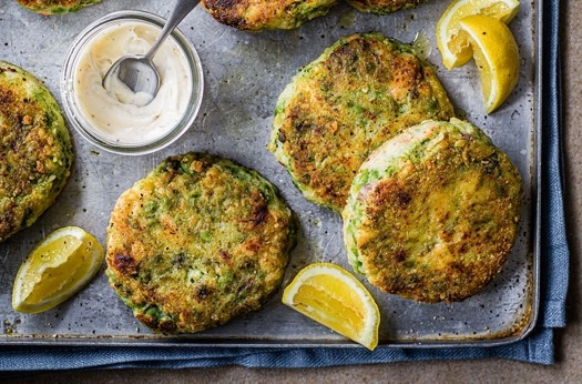 Crispy hot smoked salmon, broccoli & pea fish cakes