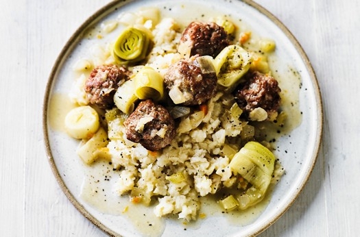 This easy caserole brings together flavourful pork meatballs, leeks and a soffritto mix, cooked in the cooks' ingredients chicken stock and served with celeriac mash.