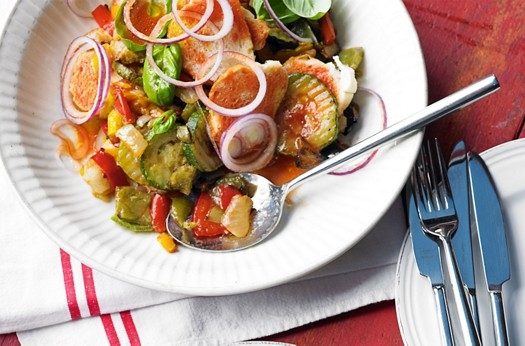This easy salad makes for a tasty lunch with grilled vegetables, fresh basil, bursting with mediterranean flavour, and a home-made dressing.