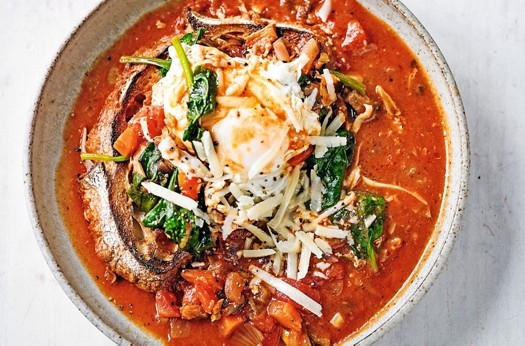 Italian vegetable soup with poached eggs & bread