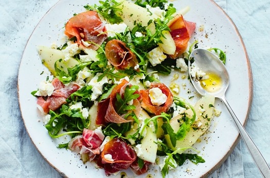 A delicious salad with sweet melon to cut through rich feta and cured ham, served with a citrus dressing.