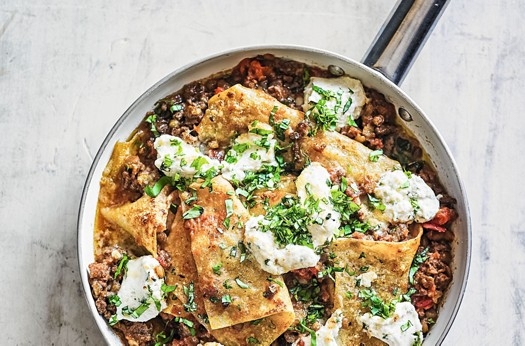 Add the remaining ½ tbsp oil to the pan, then add the soffritto and fry over a medium heat for 2-3 minutes. Return the meat to the pan and stir in the tomatoes, lentils and 200ml water. Simmer for 5 minutes, then nestle in the pasta sheets and simmer for 5 minutes more.