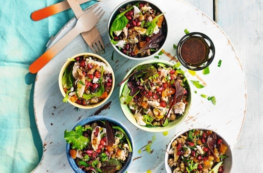 Portable pots of chicken, fruits, nuts and seeds with salad leaves and a tangy sumac dressing – perfect for picnics.