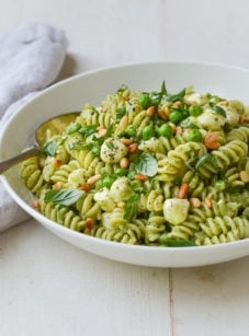 Zesty pesto, peas, pine nuts, and mozzarella pearls make a flavorful and pretty pasta salad.