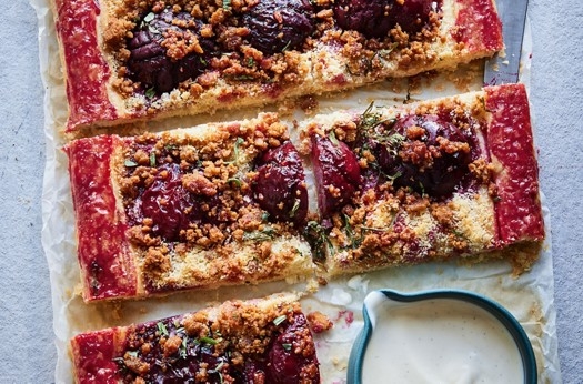 Plum & tarragon puff tart with a ginger nut crumble