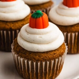 Super light and moist pumpkin cupcakes recipe topped with cinnamon cream cheese frosting and a pumpkin candy, for a fun and easy fall dessert!