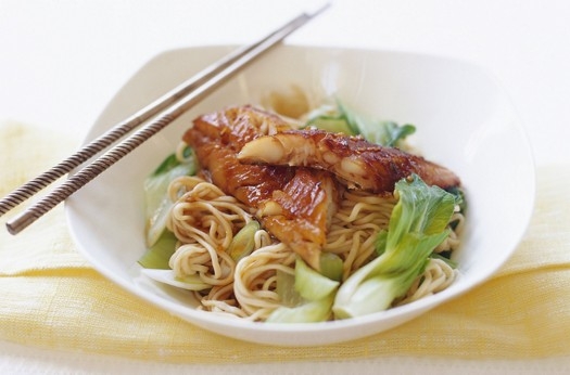 Teriyaki fish with pak choi and noodles